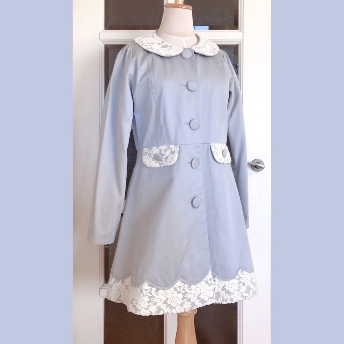 - an another angelus レース スカラップ ロングコート ライトグレイッシュブルー 春秋向き Fi.n.t ステンカラーコート 綿 コットン かわいい