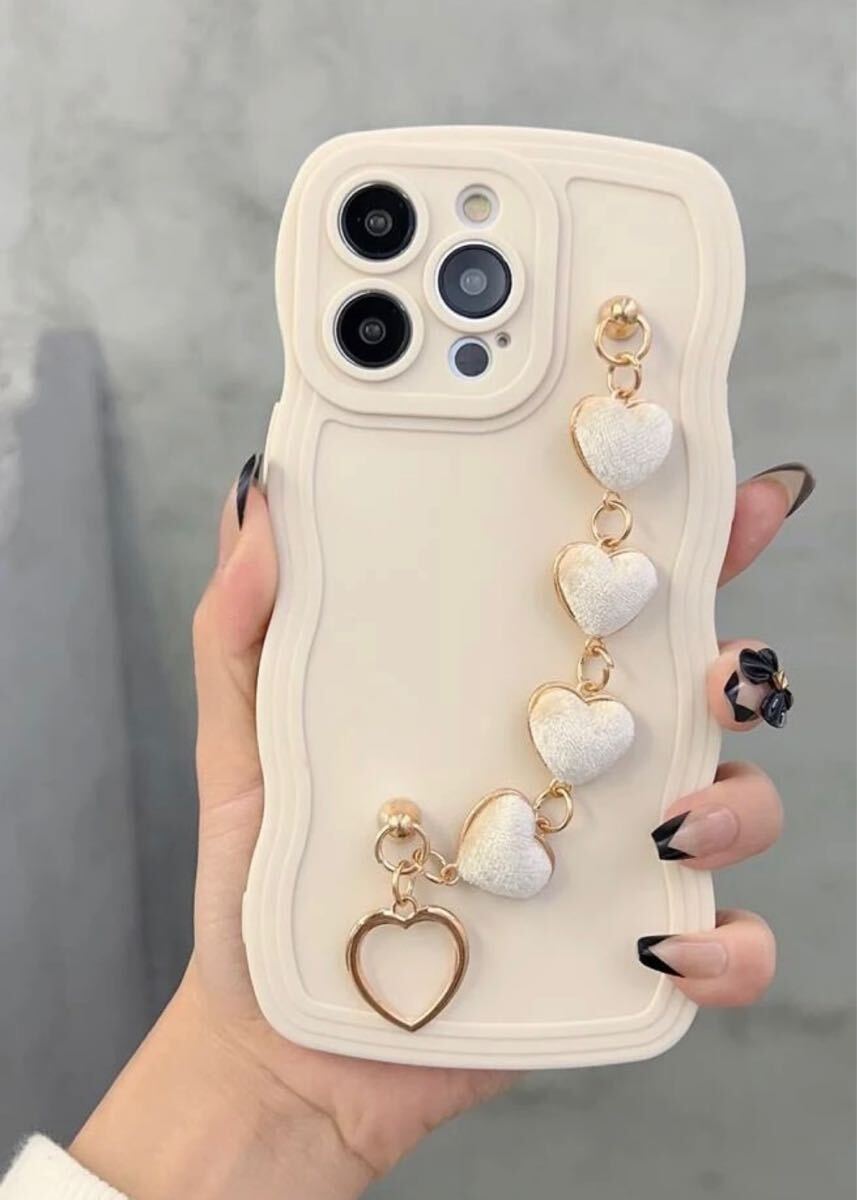 > iPhone16用 かわいい スマホケース ハートデコレーションハンドストラップ ベージュ