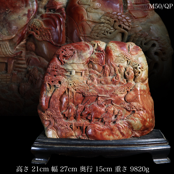 - ◇雅◇ 中国美術 古寿山芙蓉石彫 山水楼閣図 七賢人 石置物 台付 唐木 中国古玩 高さ21cm/9820g 極細工 オブジェ 彫刻 /FT.24.8 [M55] QP