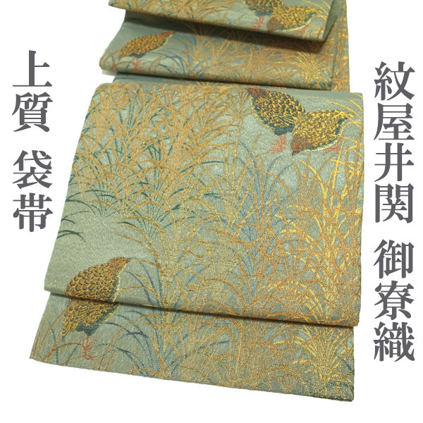 - 袋帯 紋屋井関 御寮織 渋灰緑 ウズラ 草花 金糸 カジュアル セミフォーマル 茶会 七五三 入卒式 正絹 絹 なごみ 中古 仕立て上がり kp1750