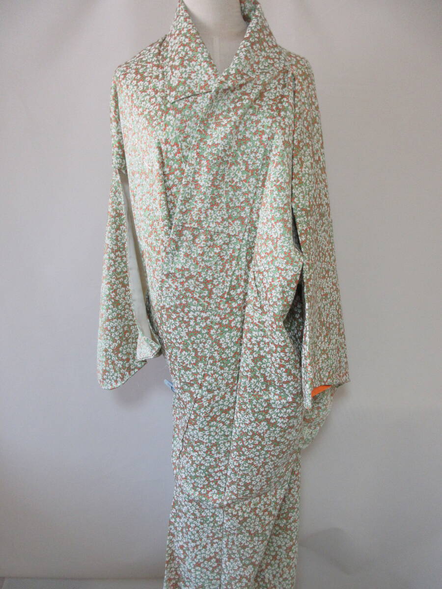 - 46-7 着物 小紋? しつけ付 総柄 花 和装 身丈約159㎝ グリーン系 リバティー