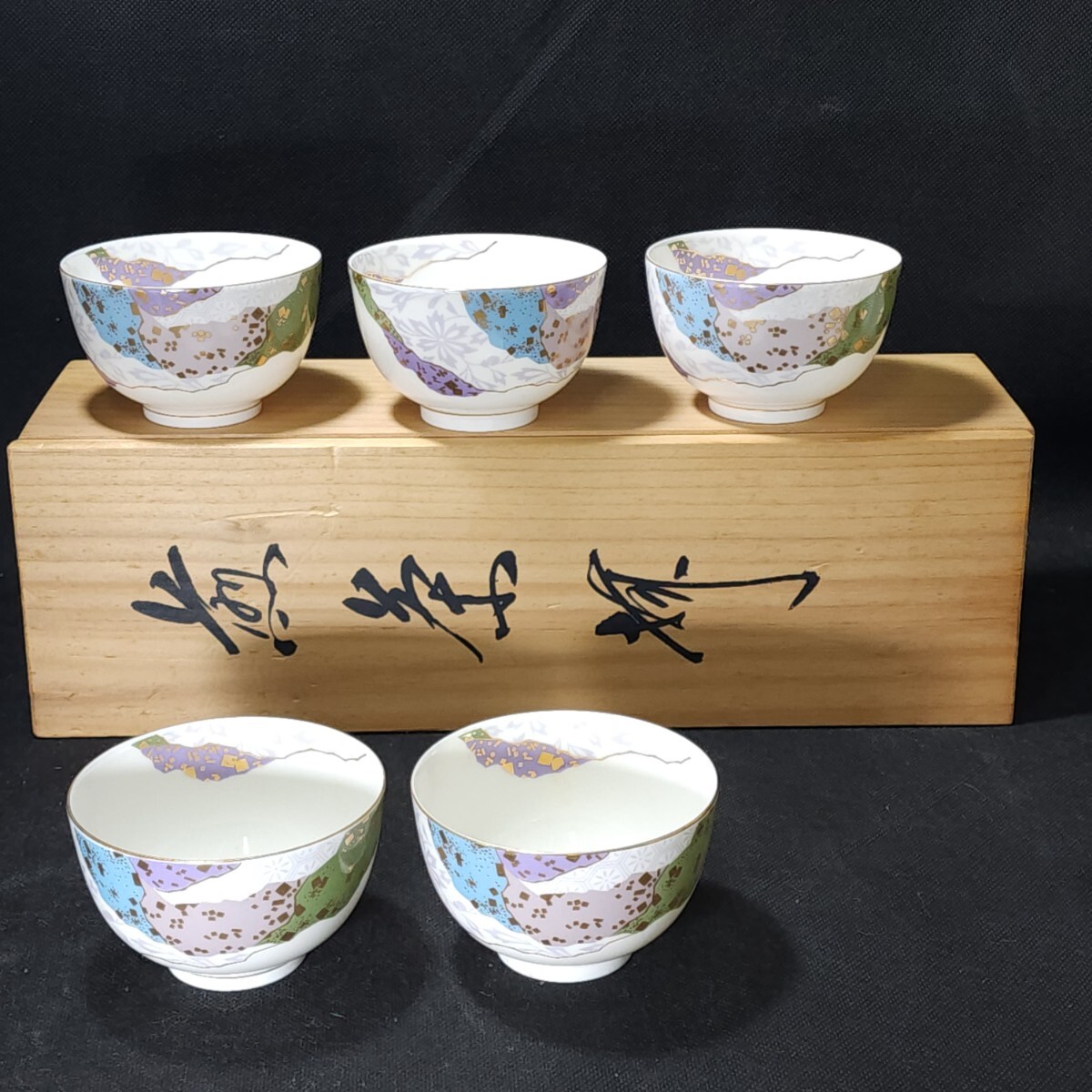 - 彩 ちぎり絵 湯呑揃 5客 未使用箱入 /食器/陶磁器/