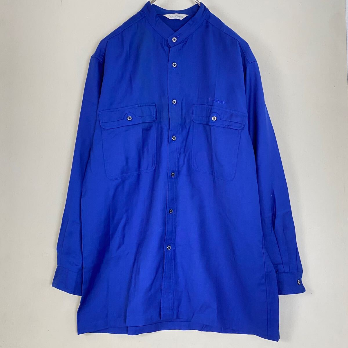 - ● ヴィンテージ PIA SPORTS バンドカラー 長袖シャツ ブルー サイズ4 ◆ ウールギャバジン ロゴ刺繍 ピアスポーツ ◆W6 LぷJI6-31