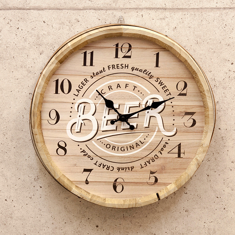 - 掛け時計 壁掛時計 ウォールクロック アナログ 円形 丸型 おしゃれ ビール BEER 樽 モチーフ デザイン 木製 秒針なし カジュアル 壁掛け