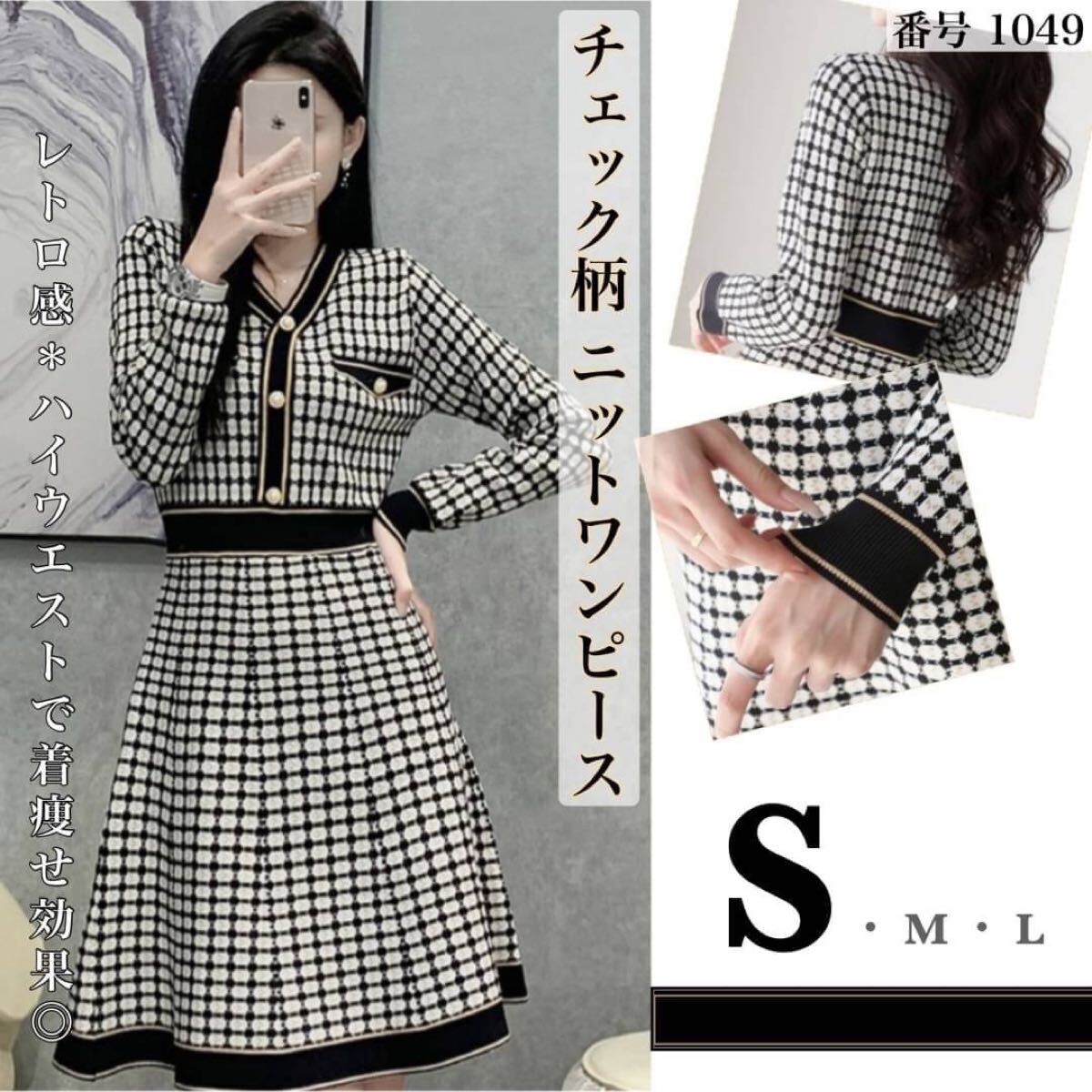 - チェック柄 ニットワンピース Vネック S レトロ感 ひざ丈 ワンピ ニット パール