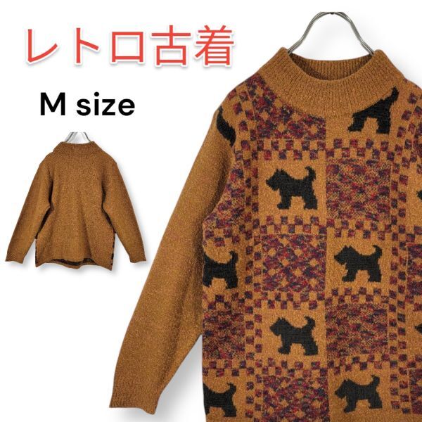 > 90s レトロ古着 日本製 アクリル ナイロン ウール ニットセーター Mサイズ ブラウン ビンテージ 総柄 犬 made in japan