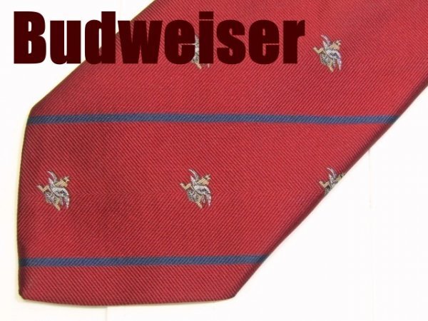 - 【ビール Budweiser 】250 バドワイザー Budweiser ネクタイ 日本製 赤系 微光沢 ストライプ柄 灯台と鳥刺繍 ジャガード