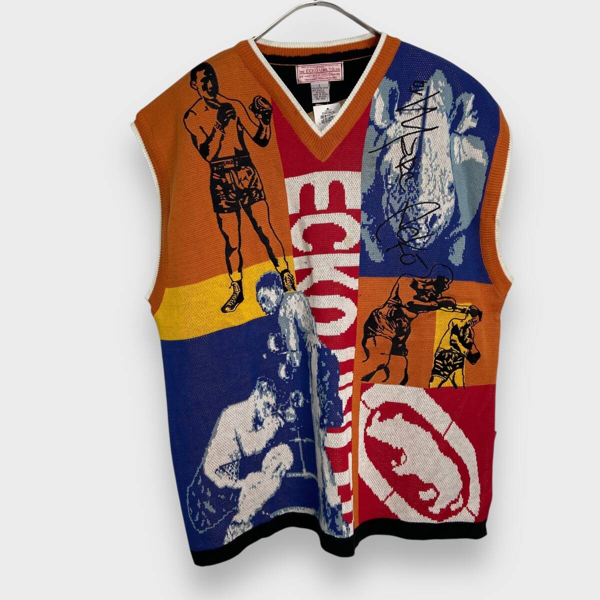 - 送料無料☆90s☆タグ付きデッドストック☆エコーアンリミテッド☆エコー☆総柄ニットベスト☆ボクサー柄☆ボクシング☆L☆L24M