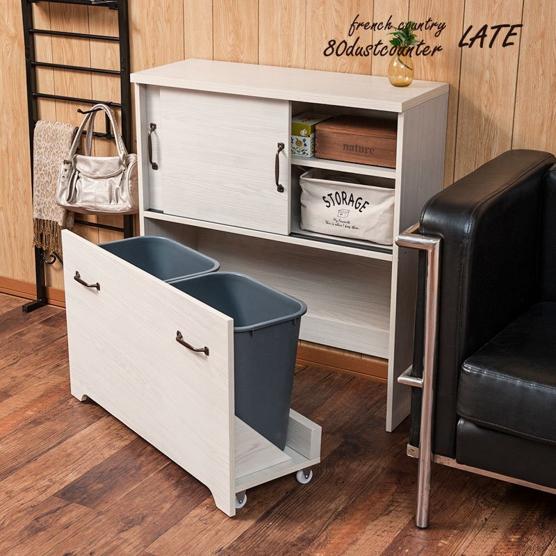 > 2分別ダストボックス付きカウンター 幅80 ホワイト木目色 ゴミ箱 ペール カウンター下 24L 大容量 キッチン キッチンラック キャビネット