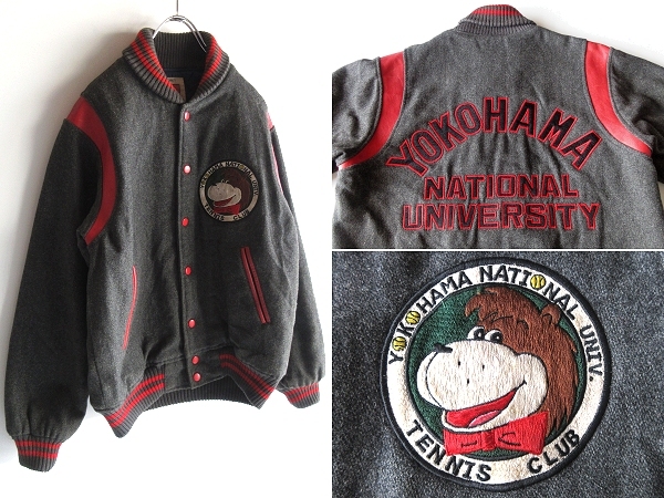 - 希少 80sビンテージ UNCLE BOV 横浜国立大学 テニスクラブ マスコットキャラワッペン アーチロゴ レザー切替 ウールメルトン スタジャン L