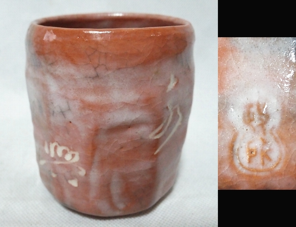 > ★【一美堂】★茶道具★京焼 赤楽★在銘『筒茶碗(湯呑)』蓋おまけ★名品★紙箱付★