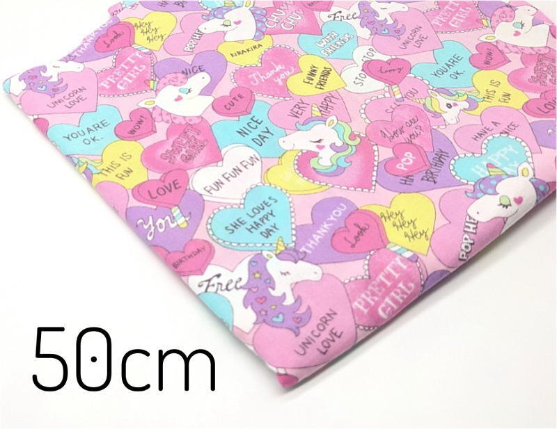 - 【50cm】ハート&ユニコーン柄 ピンク★綿 コットン Wガーゼ ダブルガーゼ★ハギレ 生地 布 カットクロス 手芸 裁縫 かわいい