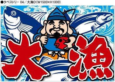 - タペストリー横断幕「大漁旗D えびす様 真鯛 マグロ 鮪 鮭 新鮮魚介 商売繁盛 千客万来 北海道 お持ち帰り 大漁祭 寿司 刺身」送料360円!