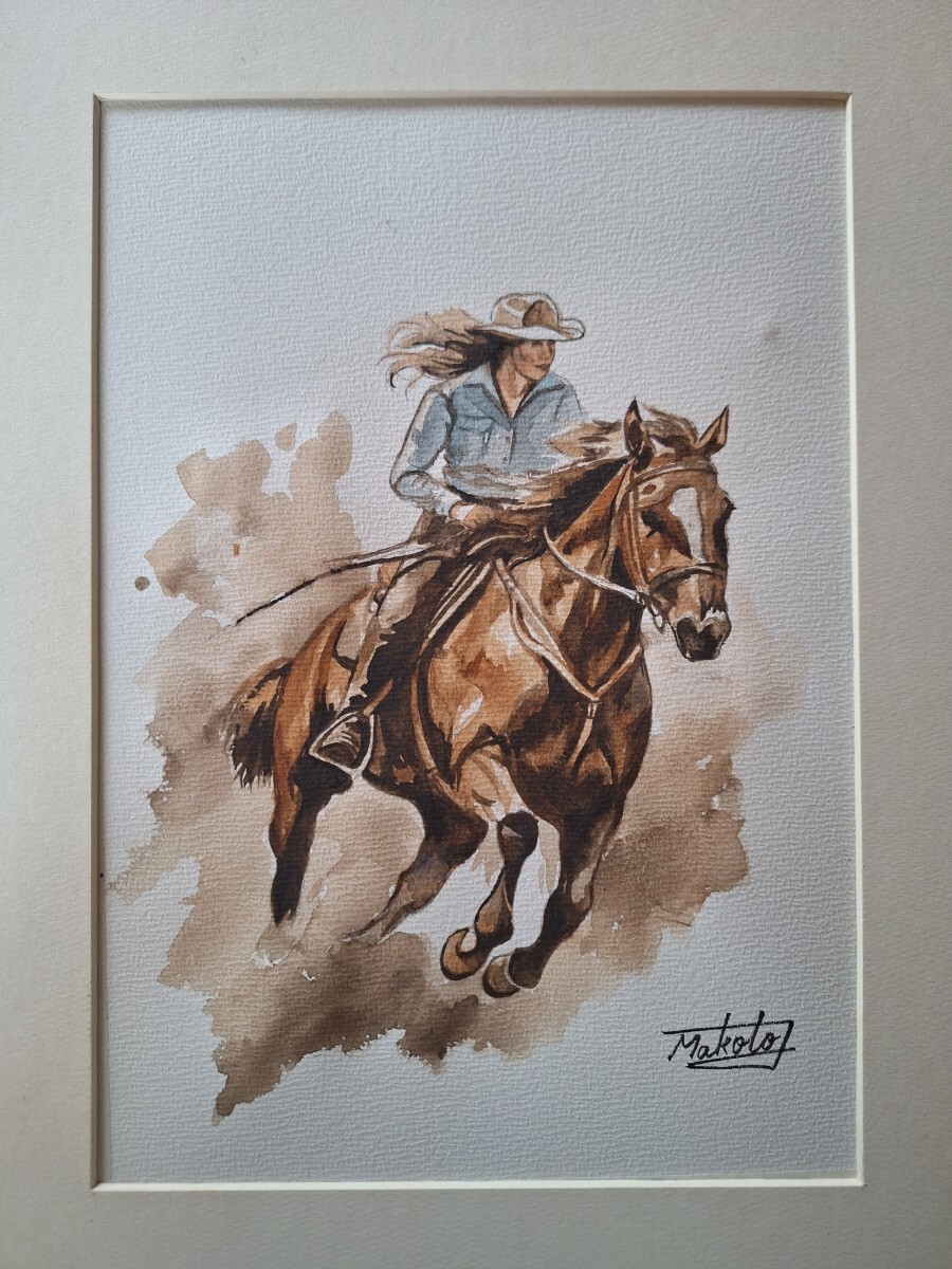- 水彩画 駿馬に乗るカウガール