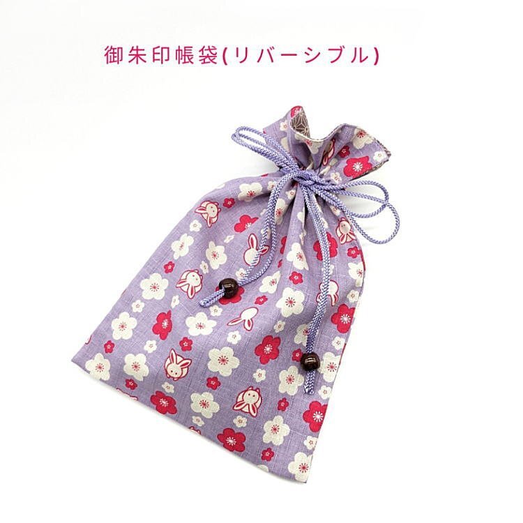 - 御朱印帳袋・リバーシブル【和柄 うさぎ&梅の花柄/麻の葉柄 パープル】+超ミニ巾着袋(お守り袋)つき!巾着袋 日本製 兎 干支 古希