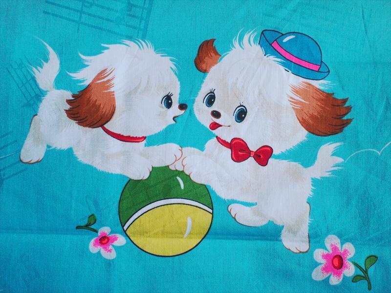 - レトロビンテージ生地・難有!・音符の綸子ブルー地マリと帽子のおしゃまなワンちゃん・綿・90×73☆リメイク