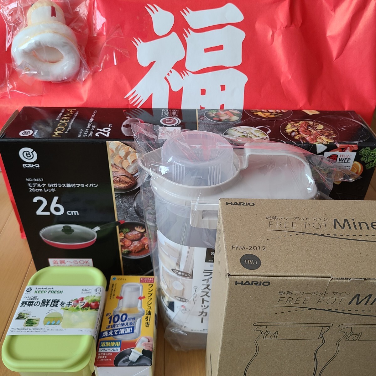 - DCM ホーマック 2025福袋 ヘビぬいぐるみ付 26cmフライパン ライスストッカー 耐熱フリーポット ワンプッシュ油引き タッパー 0033kR701