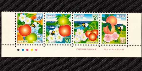 - [25010902]【ふるさと切手・東北のくだもの】4種連刷 銘版・CM付「青森 岩手 山形 福島:りんご さくらんぼ もも」50円×4 2005年発行
