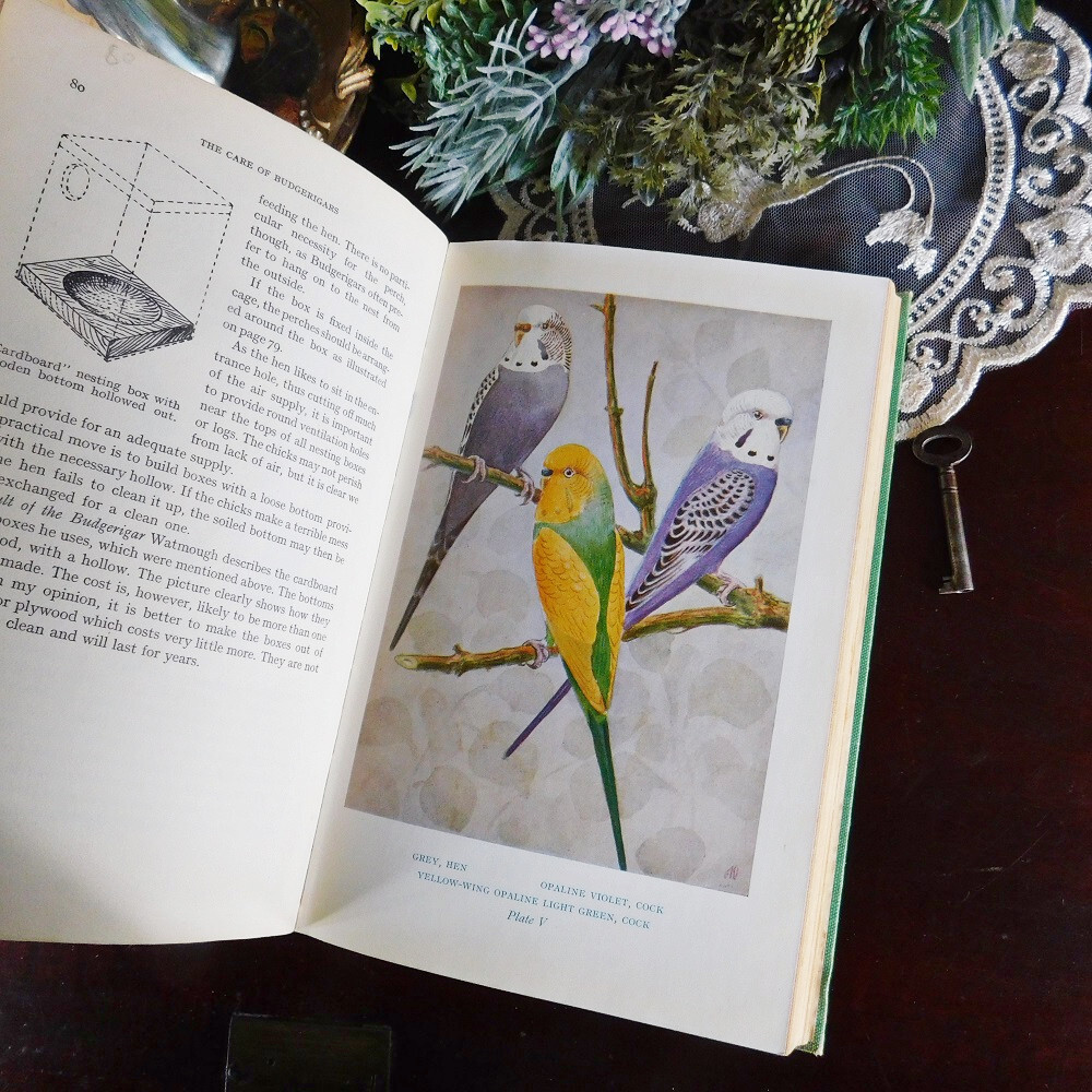- +..。*゜+ セキセイインコのヴィンテージ本 イラスト豊富な古書 アンティークブック ヴィンテージ本 洋書 古書 英国 小鳥
