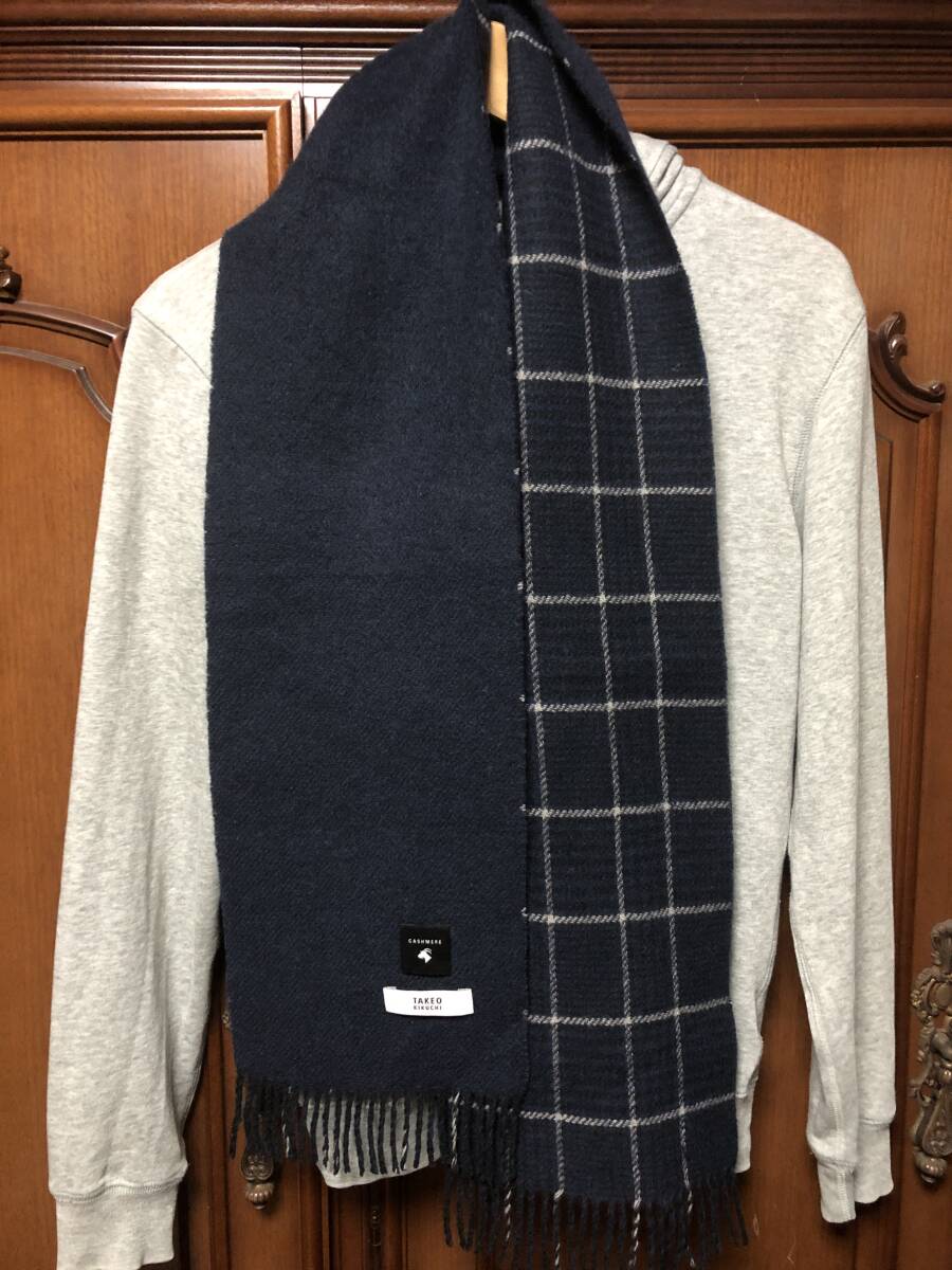 - TAKEO KIKUCHI タケオキクチ カシミヤ マフラー◆チェック柄 無地 ネイビー系