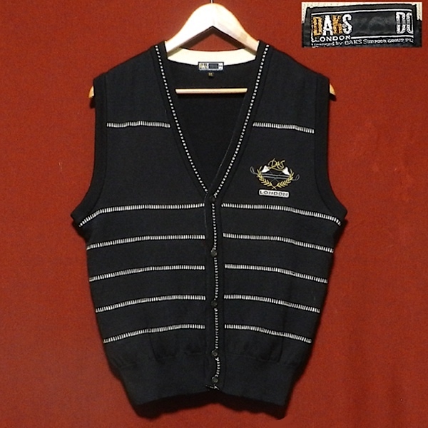 > 新品 DAKS LONDON GOLF ダックス ロゴ ボーダー編み 毛 100% Vネック ウール ニット ベスト カーディガン 黒 メンズ M 未使用