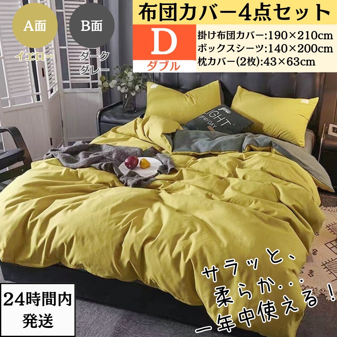 > ダブル 布団カバー4点セット 掛け布団カバー ボックスシーツ 枕カバー 寝具カバーセット リバーシブル AB両面色 イエロー+ダークグレー