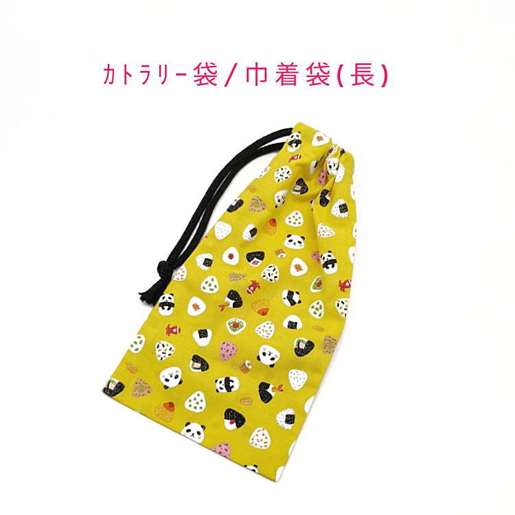 > カトラリー袋・巾着袋 長方形【おむすびパンダ柄 イエロー】カトラリーケース 箸袋 はし袋 コップ袋 ポーチ 収納袋 給食袋 おにぎり ぱんだ