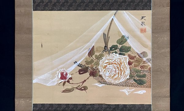 - KM8001[模写]荻生天泉「薔薇之図」掛軸 絹本 花図/バラ 橋本雅邦師事 福島の人 人が書いたもの