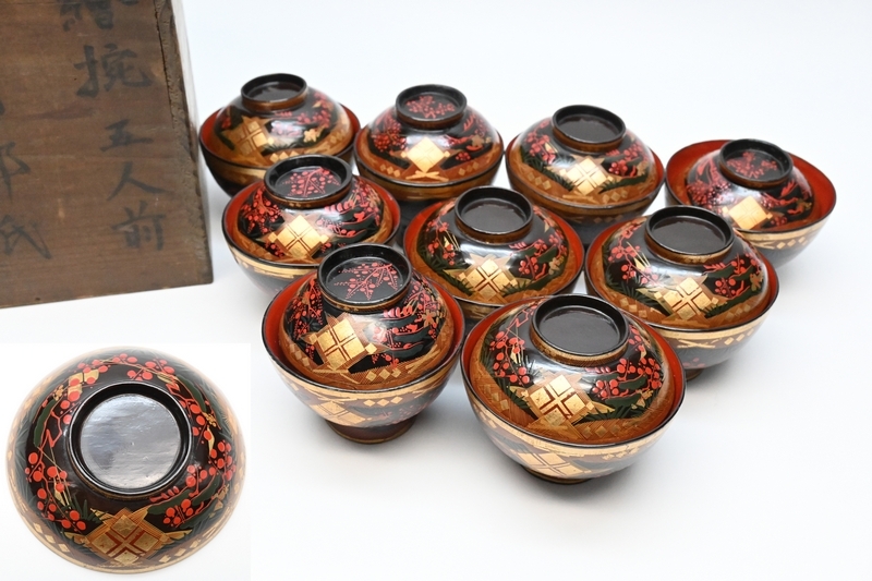 - 会津絵 蒔絵椀 ■ 小吸物椀 [ 松竹梅 ] 9客 ■ 天然木 蒔絵 漆器 時代漆器 骨董 木箱入り■