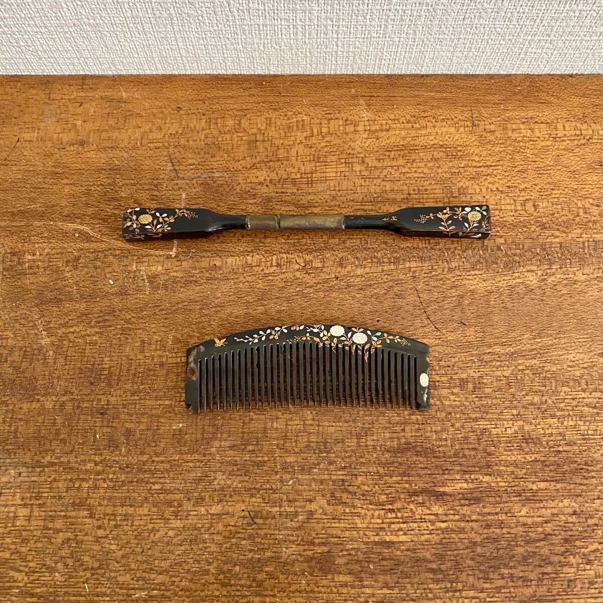 - 和装小物 くし こうがい 髪飾り 2点セット / 櫛 笄 花模様 金彩 当時物