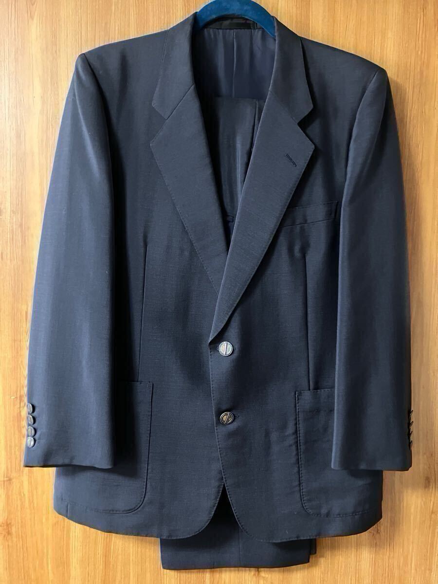 Christian Dior(クリスチャン・ディオール)のセットアップ スーツです。色は紺系で、あまり濃い(濃紺)感じではなく、画像3枚目が見た目近く撮れていると思います。サイズは胸囲95・胴囲86・身長170とタグに記載あり(身長170cm前後、中肉中背の方でしたら問題なくご着用頂けるかと思います。素人採寸ですが平置き実寸でジャケット身丈74cm・袖丈59cm・肩幅44cm・身幅46cm位?、ズボン股上36cm・股下76cm・裾幅24.5cm・わたり幅33cm位。少しでもご参考になればと思います)、素材は毛100%、クリーニング済み。