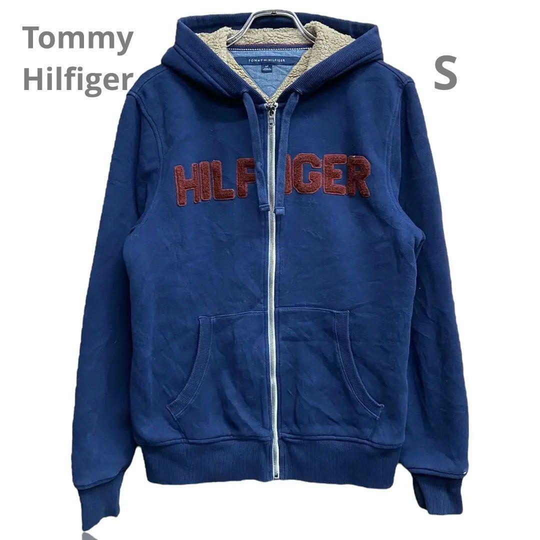 > トミーヒルフィガー メンズパーカー S 紺 裏地ボア ロゴ 秋冬 【1415】