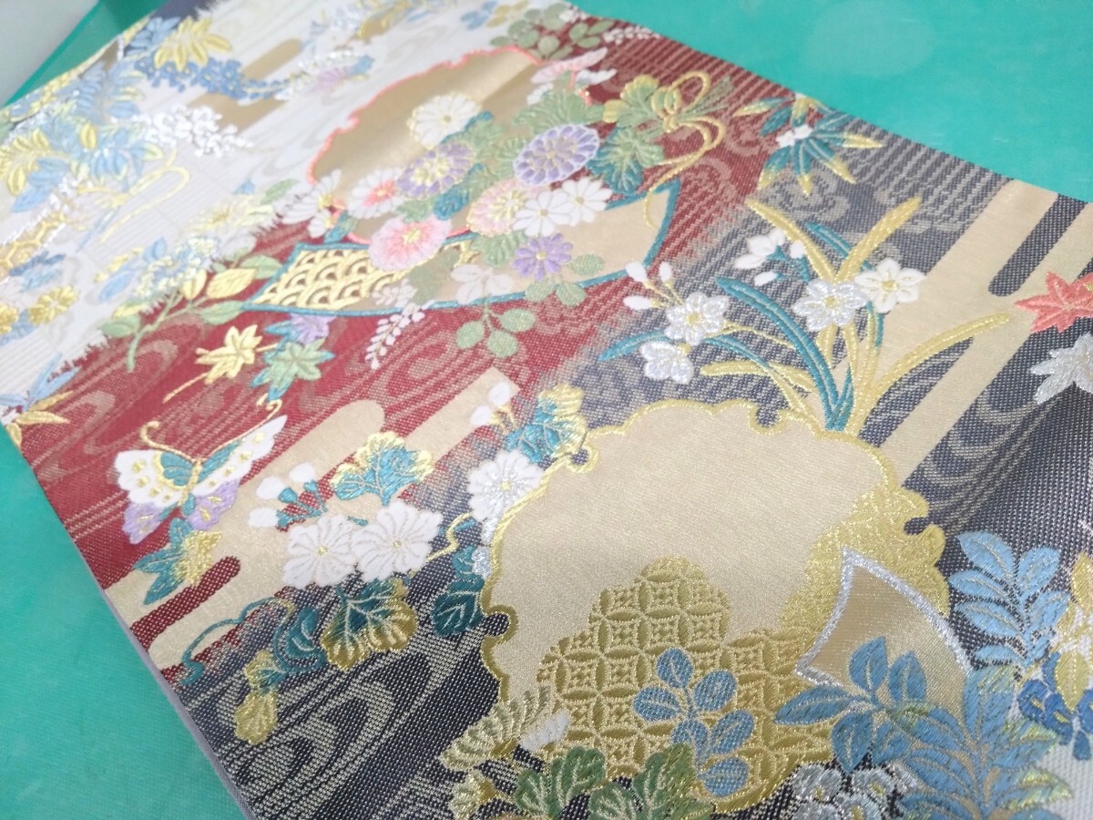- ●13 高級 袋帯【風雅天晴/京洛苑はたら謹製】地紙花蝶文 蝶 菊 水仙 藤 紅葉 赤/アイボリー/グレー系 金糸 金彩 豪華絢爛 六通 帯 ③