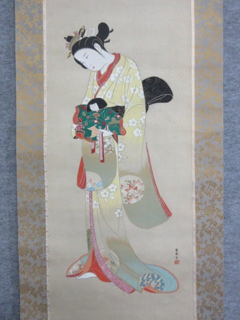 > 【模写】 掛軸 美人画 絹本 [B27945] 長さ1767cm 幅50.5cm 百合子 宮崎 掛け軸 人物 床の間 飾り 古玩 古美術