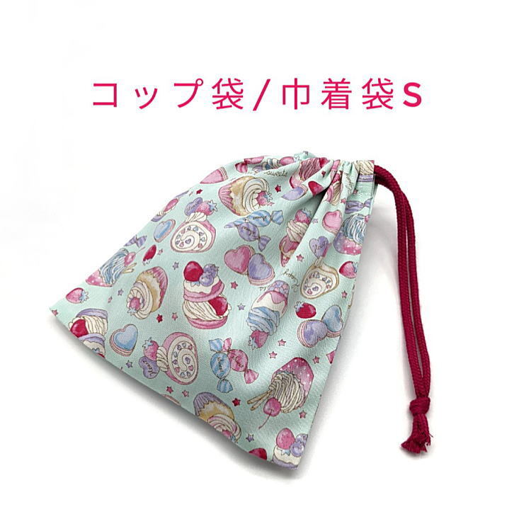- コップ袋・巾着袋S【スイーツケーキ柄 ミント】マチ無し 日本製 ランチ袋 ナフキン入れ ポーチ 給食袋 入園 入学 カップケーキ マカロン