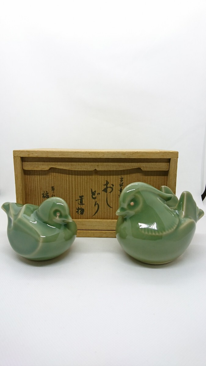 - 青瓷 平安橘吉 吉祥寺 おしどり 橘吉 置物 木箱付き 鳥 インテリア 飾り 銘入り アンティーク レトロ 美術 工芸品 たち吉