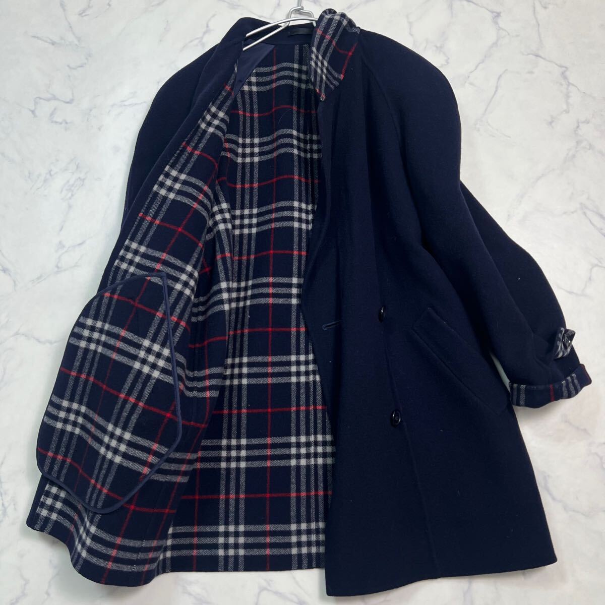 > バーバリーズ Pコート ネイビー リバーコート 袖裏チェック ウール ノバチェック レディース L相当 BURBERRY B0041