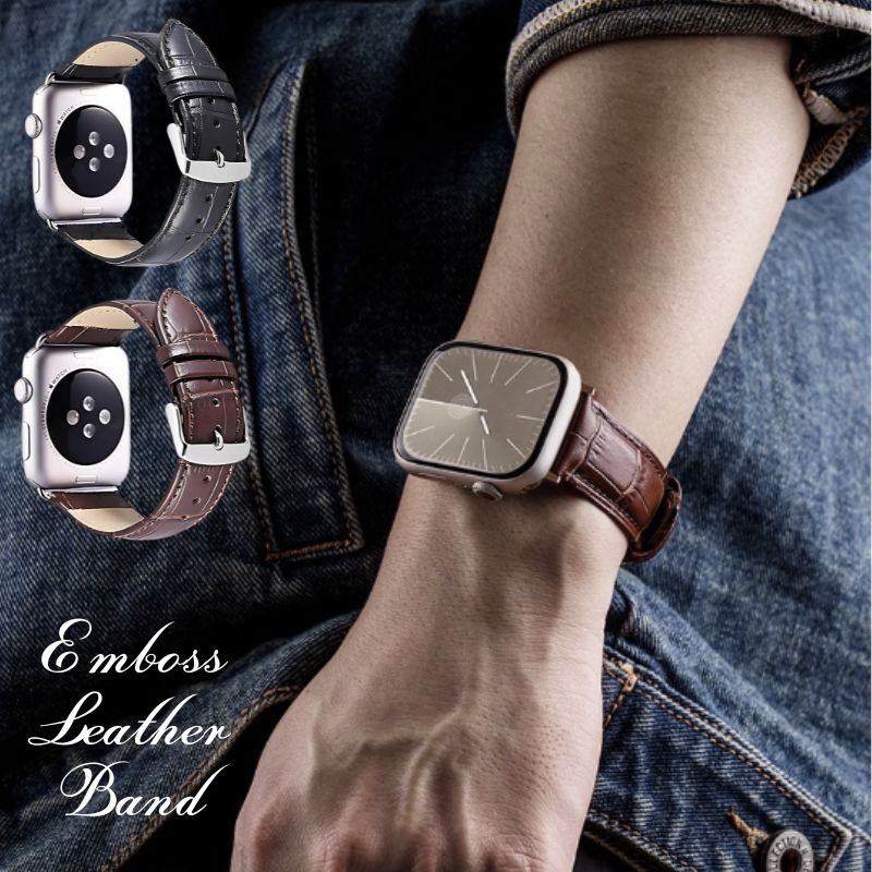 > YGG★新品 Apple Watch アップルウォッチ 型押し レザー 革 皮 ベルト バンド 44mm 45mm 46mm 49mm 黒 ブラック 交換 メンズ レディース