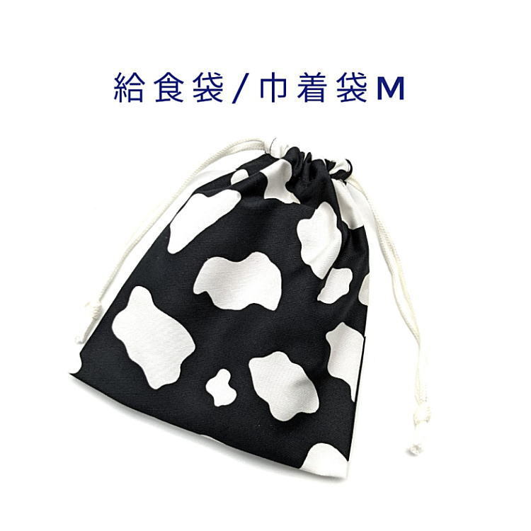 - 給食袋・巾着袋M【うし柄 ブラック×ホワイト】マチ無し 日本製 ランチ袋 ナフキン入れ ポーチ コップ袋 牛 丑 ウシ アニマル