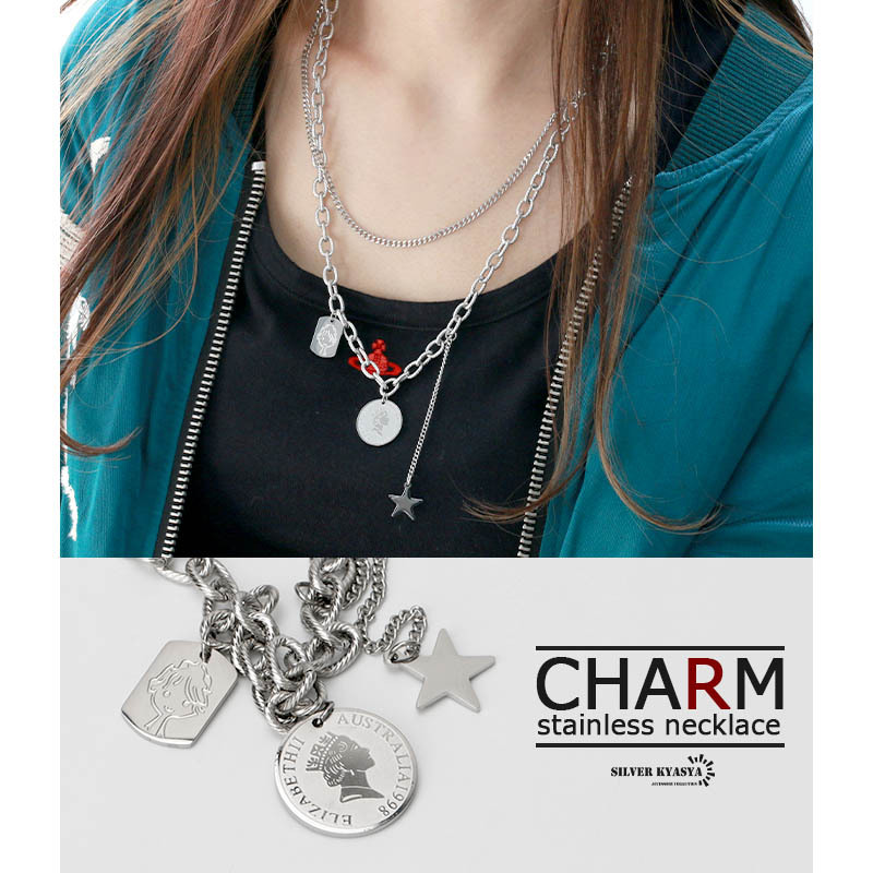 - 2連 チェーンネックレス ステンレス ダブルチェーンネックレス ドッグタグ 喜平 あずき 金属アレルギー コイン 星 スター