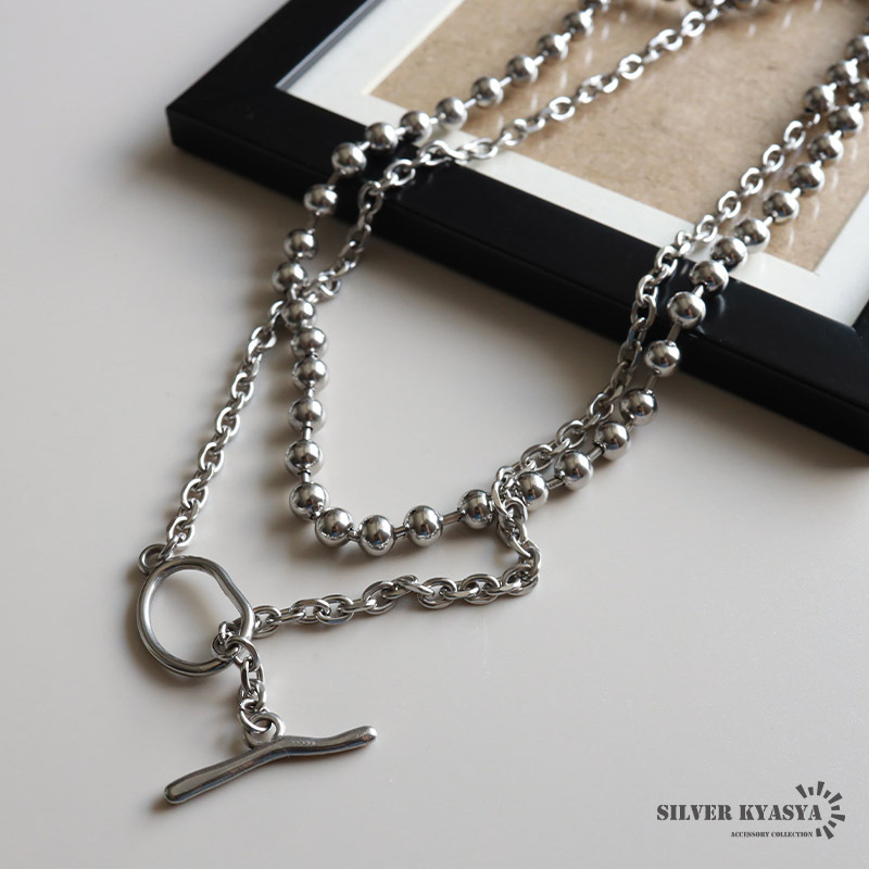 - 2重ネックレス 2連 レディース ボールチェーン マンテル ネックレス 女性 シルバー ステンレス 金属アレルギー対応