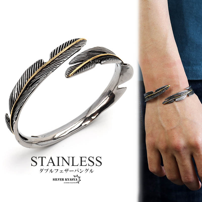 - ステンレス素材 ダブルフェザーバングル ゴールドライン ワンポイント羽根バングル ブレスレット シルバー