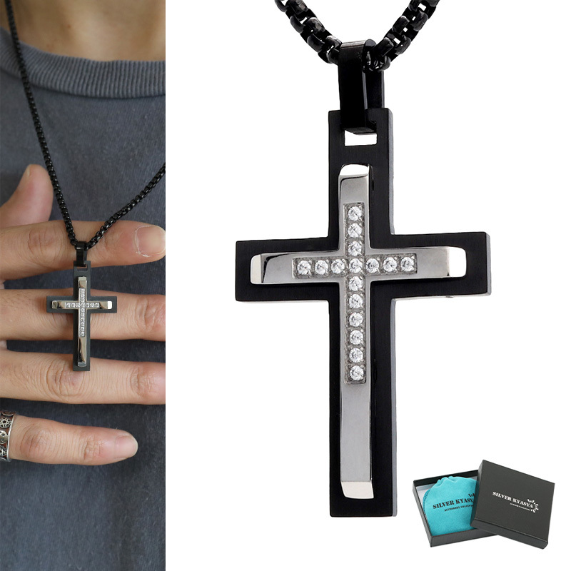 - 高級感あり 機械美 クロスネックレス 黒 十字架 メンズネックレス ステンレス 定番 ストーン付き チェーン付き 専用BOX付属
