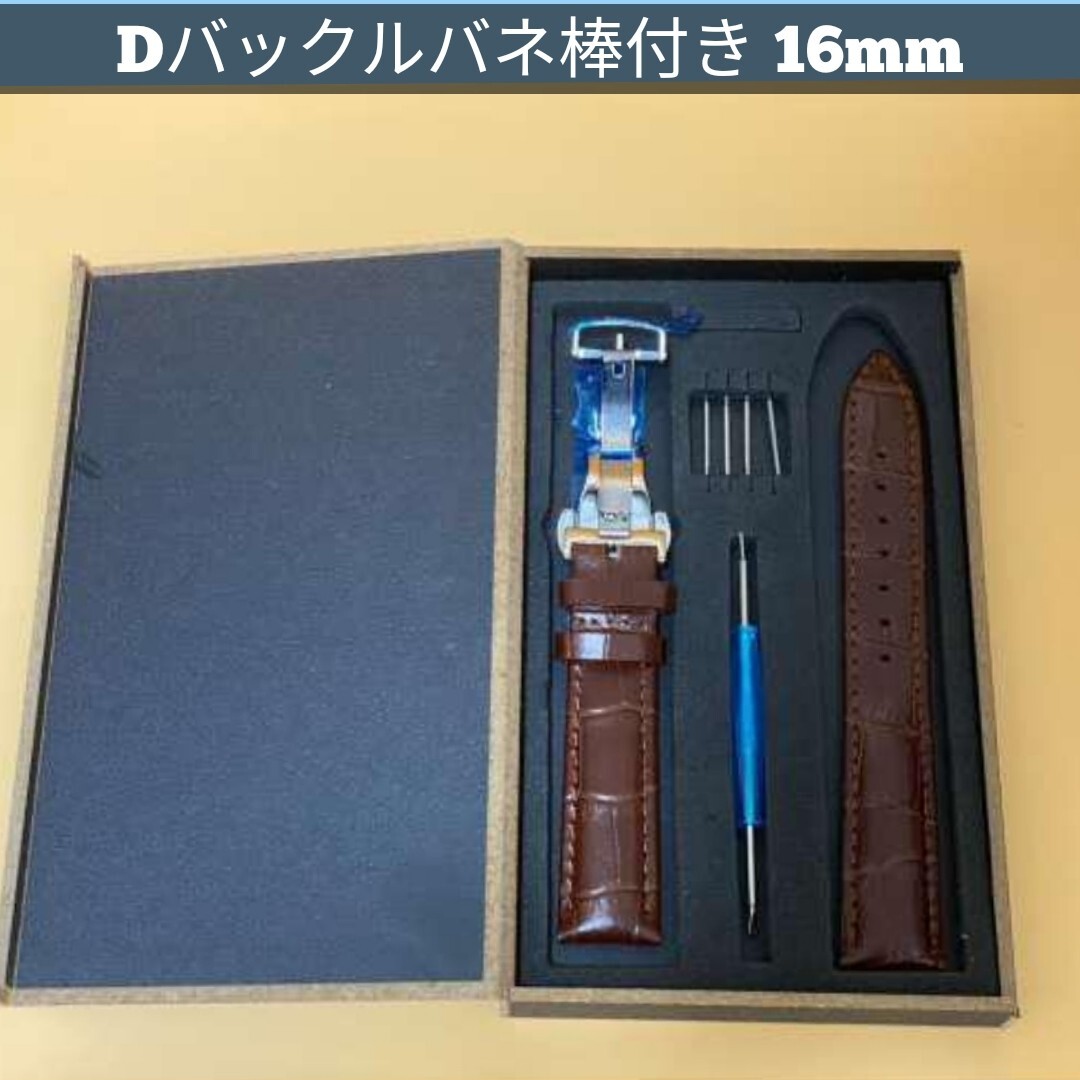 - 腕時計ベルト レザーベルト Dバックル 革ベルト バネ棒 外箱 スペアベルト 腕時計バンド 時計バンド 16mm プッシュバックル