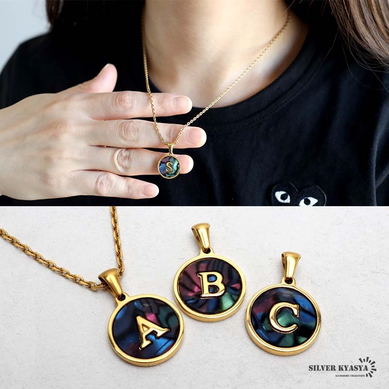 > (N、50cm) イニシャルネックレス ゴールド オーロラ ラウンド ステンレス 18KGP あずきチェーン 金属アレルギー対応