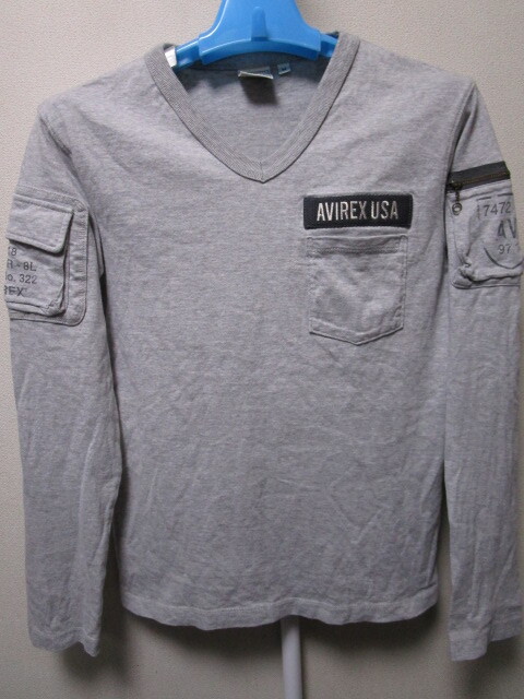 - AVIREX FATIGUE V-NECK L/S TEE・M・グレー(アヴィレックスファティーグVネックロンTシャツ3ポケット付きミリタリー長袖Tシャツ)