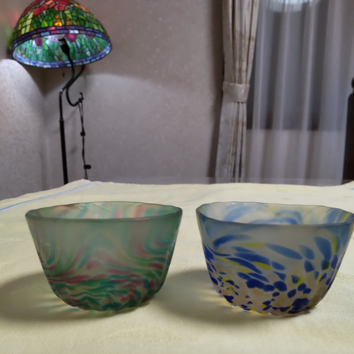 > グラス ぐい呑 2個セット ハンドメイド 春秋 四季の色散らし 手造り お酒で絵柄が浮かび上がる不思議なグラス 冷酒グラス お猪口