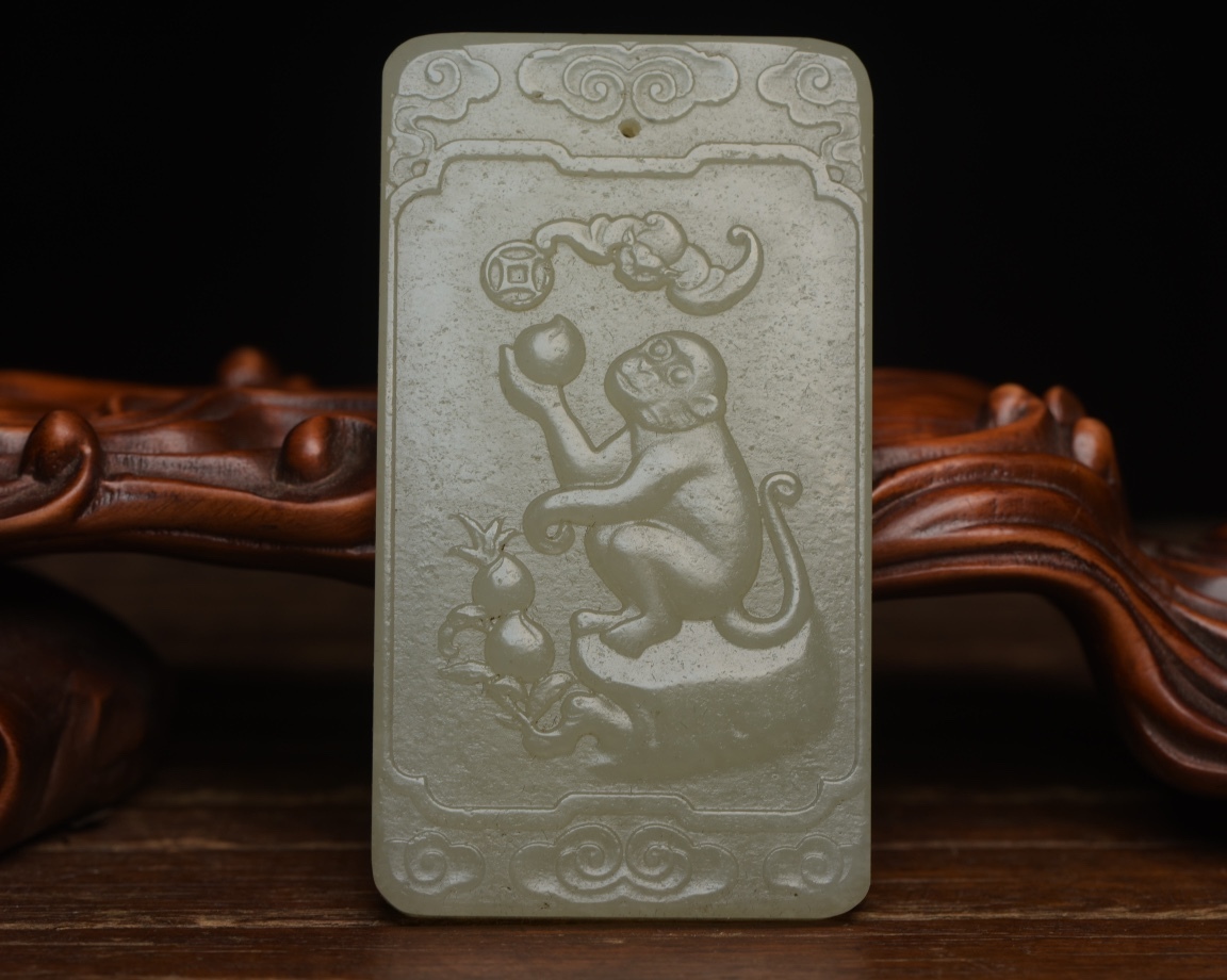 - 『清・古和田玉彫・青白玉・猴牌・鏈付・箱付・』極細工・時代物・東洋彫刻・古賞物・中国古玩・中国古美術