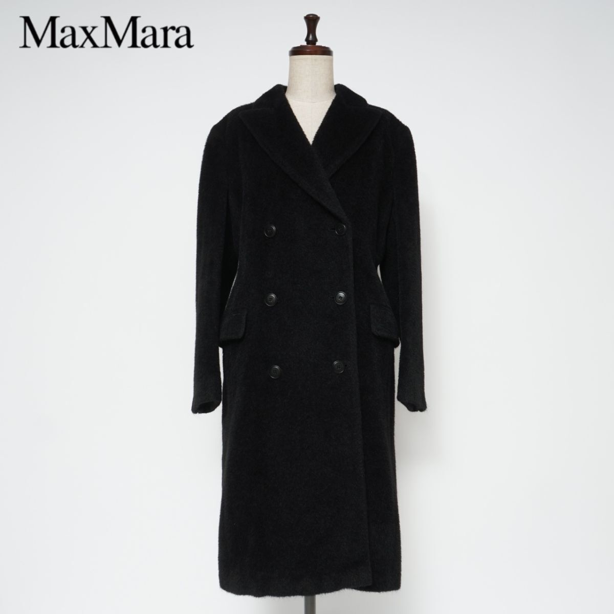 > 美品 MaxMara マックスマーラ アルパカ ウール ダブルブレスト 白タグ シャギー 裏地総柄 ウエストベルト付 黒 ブラック サイズ36*YC37