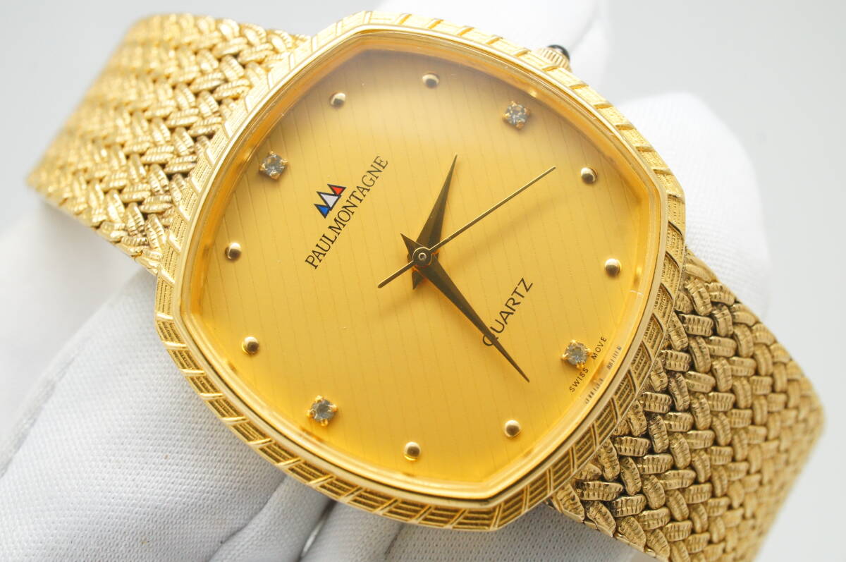 > B49●作動良好 PAULMONTAGNE ポールモンターニュ 4P石付 金文字盤 クッション型 メンズ腕時計 ゴールド金 お洒落 クォーツ